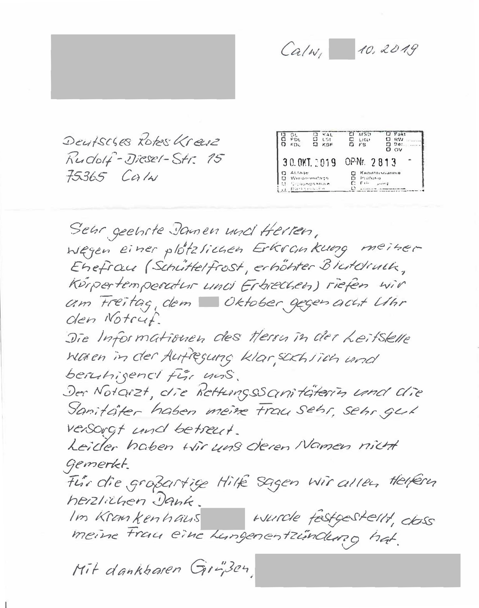 Ende Oktober erreichte uns beigefügter Brief eines Mannes, dessen Ehefrau von Mitarbeitern unserer Integrierten Leitstelle und von einem Einsatzteam der Notfallrettung versorgt und transportiert wurde. Das Lob nehmen wir gerne an und hoffen natürlich auf weitere positive Rückmeldungen. Denn das schwäbische Zitat "Nix gsagt ischt gnug globt!" taugt nicht viel für den Ansporn, es in Zukunft noch ein bisschen besser zu machen.