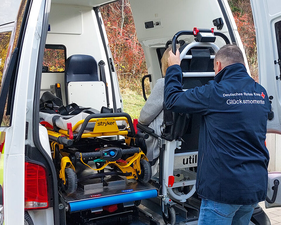 Da Frau H. körperlich stark eingeschränkt ist, brachten Jürgen und Wolfgang sie mithilfe des Tragestuhls sicher aus dem ersten Obergeschoss zum Fahrzeug. Während der gesamten Fahrt stand Jürgen ihr fürsorglich und aufmerksam zur Seite – ein leiser, aber tröstlicher Beistand in einer Situation, in der Worte kaum genügen.