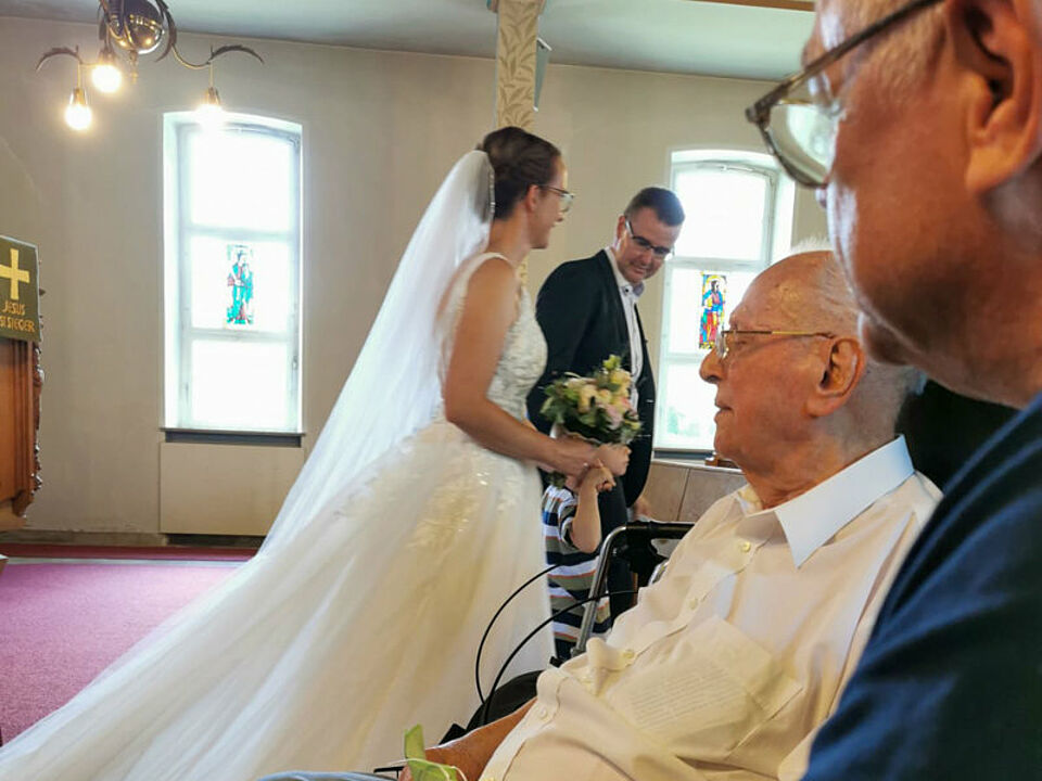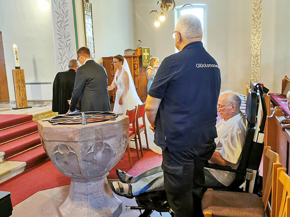 Die Trauung selbst war zutiefst emotional. Unser Fahrgast verfolgte die Zeremonie mit leuchtenden Augen und genoss jeden Augenblick in vollen Zügen. Es war ein bewegender Moment, seine Enkelin in Weiß vor dem Altar zu sehen. Beim anschließenden Ständerling im Gemeindehaus konnte er viele Verwandte, alte Freunde und Bekannte wiedersehen. Die Freude über das Wiedersehen war auf beiden Seiten groß – herzliche Umarmungen und dankbare Worte prägten den Tag.