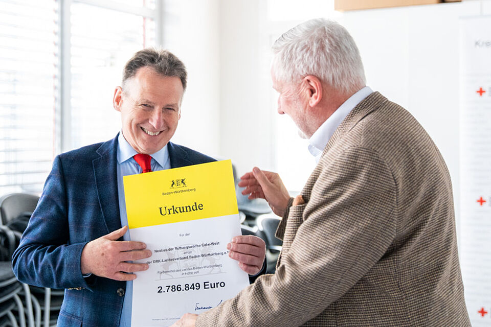 Ein wichtiger Meilenstein für die Rettungsdienstinfrastruktur im Landkreis Calw: Staatssekretär und Mitglied des Landtages (MdL) Thomas Blenke übergab dem DRK-Kreisverband Calw e.V. die offizielle Förderurkunde des Landes Baden-Württemberg für den Neubau des DRK-Zentrums Calw-West am Würzbacher Kreuz. Die Übergabe fand in den Räumen der DRK-Kreisgeschäftsstelle statt, wo neben Präsident Walter Beuerle auch das Präsidium des Kreisverbandes und Vertreter aus dem Rettungsdienst den Staatssekretär empfingen.