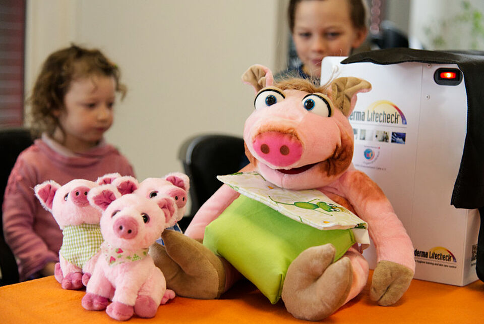 „Unser Schwein, „Herr Schweini Sau“, ist manchmal im wahrsten Sinne des Wortes ein richtiges Schwein, welches die Hygieneregeln noch nicht so ganz verstanden hat. Damit sich das ändert, darf es bei keiner Hygieneschulung in Kindergärten und Schulen fehlen.“ „Herr Schweini Sau“ niest ganz oft sehr kräftig - und das noch nicht einmal in die Armbeuge.