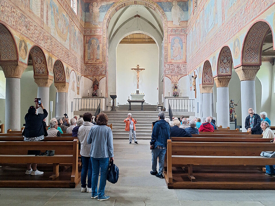 Zum Abschluss unserer Inselrundfahrt, der Regen hatte zwischenzeitlich nachgelassen, besuchten wir die Kirche Sankt Georg, ein echtes Juwel der romanischen Baukunst. Besonders beeindruckend waren die gut erhaltenen Wandmalereien aus dem 10. Jahrhundert, die biblische Szenen auf eindrucksvolle Weise darstellen. Unsere Führerin erklärte uns deren Bedeutung mit viel Fachwissen. Nach so vielen Eindrücken und Geschichten kehrten wir mit vielen schönen Erinnerungen im Gepäck wieder zurück in den Bus.