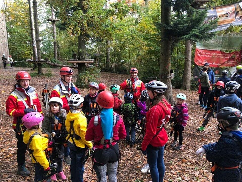 Zum Gruppenauftakt haben wir uns mit beiden Jugendrotkreuzgruppen auf dem Gelände des DRK-Ortsvereins Calw e.V. getroffen, um von dort mit Rotkreuzfahrzeugen gemeinsam zum Hochseilgarten in Rutesheim zu fahren. Wie es der Zufall so wollte, hatten wir herrliches Wetter und eine Menge Spaß. Bei 14 Kletterparcours mit über 204 Übungen, Hindernisparcours, Seilbrücken und Flying Fox sind wir gemeinsam in Kleingruppen stetig an unsere Grenzen gelangt und haben sogar manche Höhenangst gemeinsam überwunden, was uns sehr stolz auf unsere mutigen JRK-ler macht.