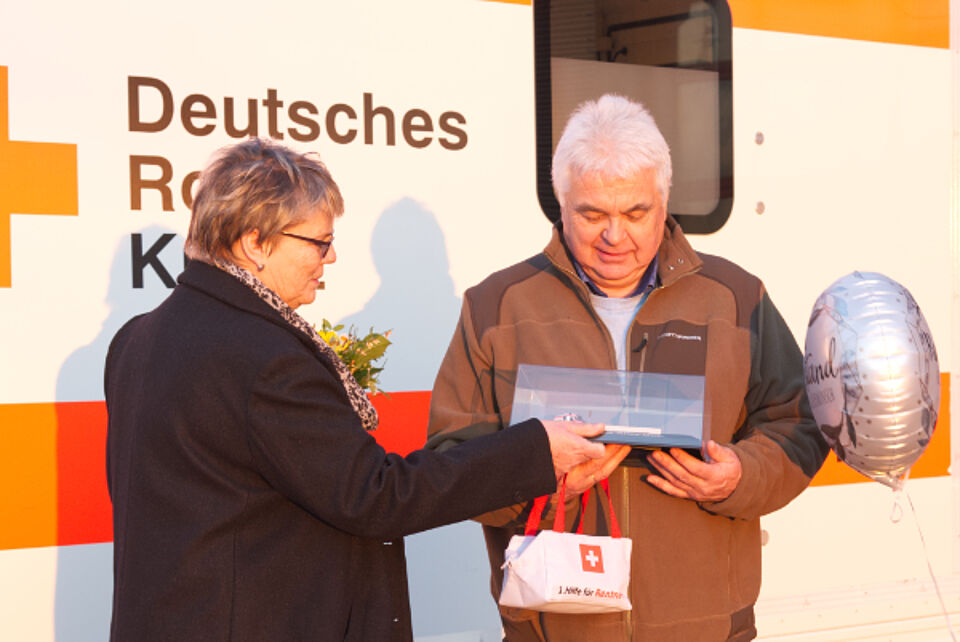 „Mit Uwe Schumacher verlieren wir eine tragende Säule des DRK, vor allem im Rettungsdienst“, ist sich Sven Brodmann, der stellvertretend für Rettungsdienstleiter Werner Schwemmle dessen Grußworte überbrachte, sicher. Er lobte vor allem das überdurchschnittliche Engagement des vielseitigen und geschätzten Kollegen. Umso beruhigender sei es da, dass Schumacher dem DRK nicht gänzlich den Rücken kehrt. Denn dieser will auch weiterhin als geringfügig Beschäftigter Dienst in der Integrierten Leitstelle leisten und im Krankentransport unterstützen. „Vor allem auf Verlegungsfahrten freue ich mich besonders. Dabei sieht man so einiges von der Welt“, erklärt Schumacher abschließend mit einem Augenzwinkern.