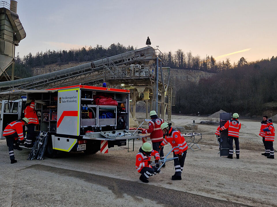 Noch in tiefer Dunkelheit begann der erste Einsatz im Schotterwerk Mast in Wildberg-Sulz. Sechs Personen galten nach dem Erdbeben als vermisst. Eine unwegsame Trümmerlandschaft machte die Suche für die Rettungshunde schwierig, doch mit beeindruckender Präzision spürten sie nach und nach die Verletzten auf. Einige waren unter Geröll eingeschlossen, andere litten unter Schock und mussten beruhigt und medizinisch erstversorgt werden.