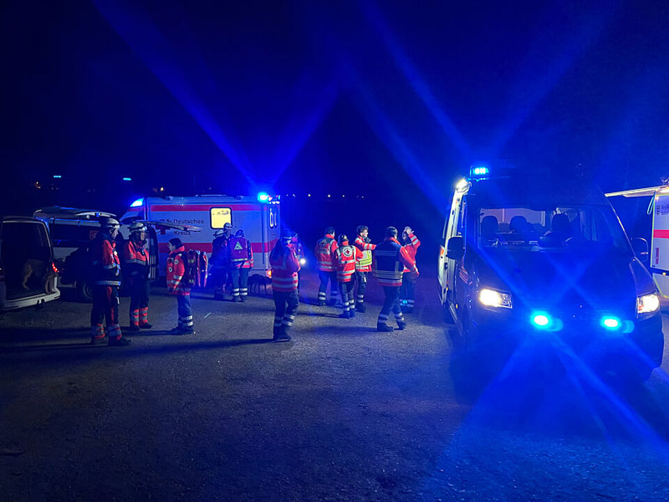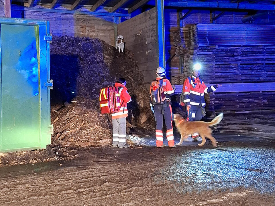 Am Abend folgte eine weitere fordernde Einsatzlage: In Ettmannsweiler war ein Sägewerk eingestürzt, vier Arbeiter wurden unter den Trümmern vermisst. Die Suche in der Dunkelheit erschwerte die Arbeit zusätzlich. Wieder bewährte sich die perfekte Zusammenarbeit zwischen den Rettungshunden und den Sanitätskräften. Während die Hunde die Vermissten aufspürten, übernahmen die Rotkreuz-Einsatzkräfte die medizinische Erstversorgung.