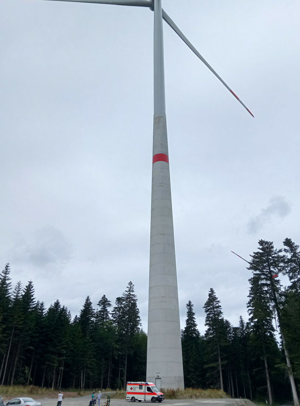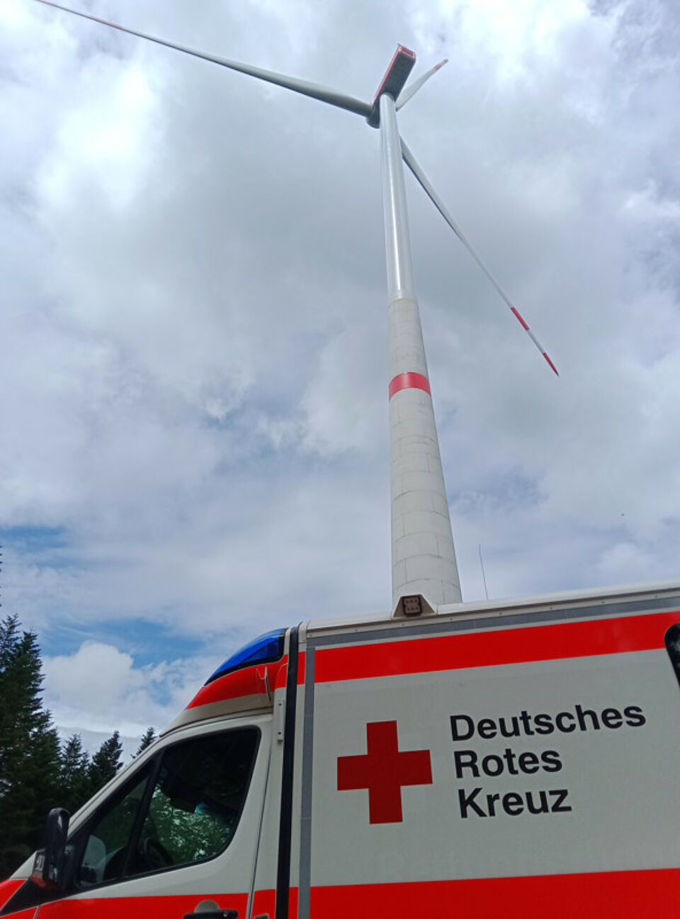 Umso genauer beobachtete er die Entstehung der Windräder. Dies löste in ihm den Wunsch aus, einen dieser Giganten aus nächster Nähe zu betrachten. Um diesen Wunsch zu erfüllen, kontaktierten seine Angehörigen die DRK-Glücksmomente. Da davon auszugehen ist, dass dem Herrn leider nicht mehr viel Zeit bleibt, erfolgte die Anfrage sehr kurzfristig. Zum Glück fanden sich mit Christian und Ralph zwei Einsatzkräfte aus der Bereitschaft des DRK-Ortsvereins Schömberg/Bad Liebenzell e.V., die neben der fachlichen Eignung sogar über entsprechende Ortskenntnis verfügten und so den Weg zu den Windrädern kannten.